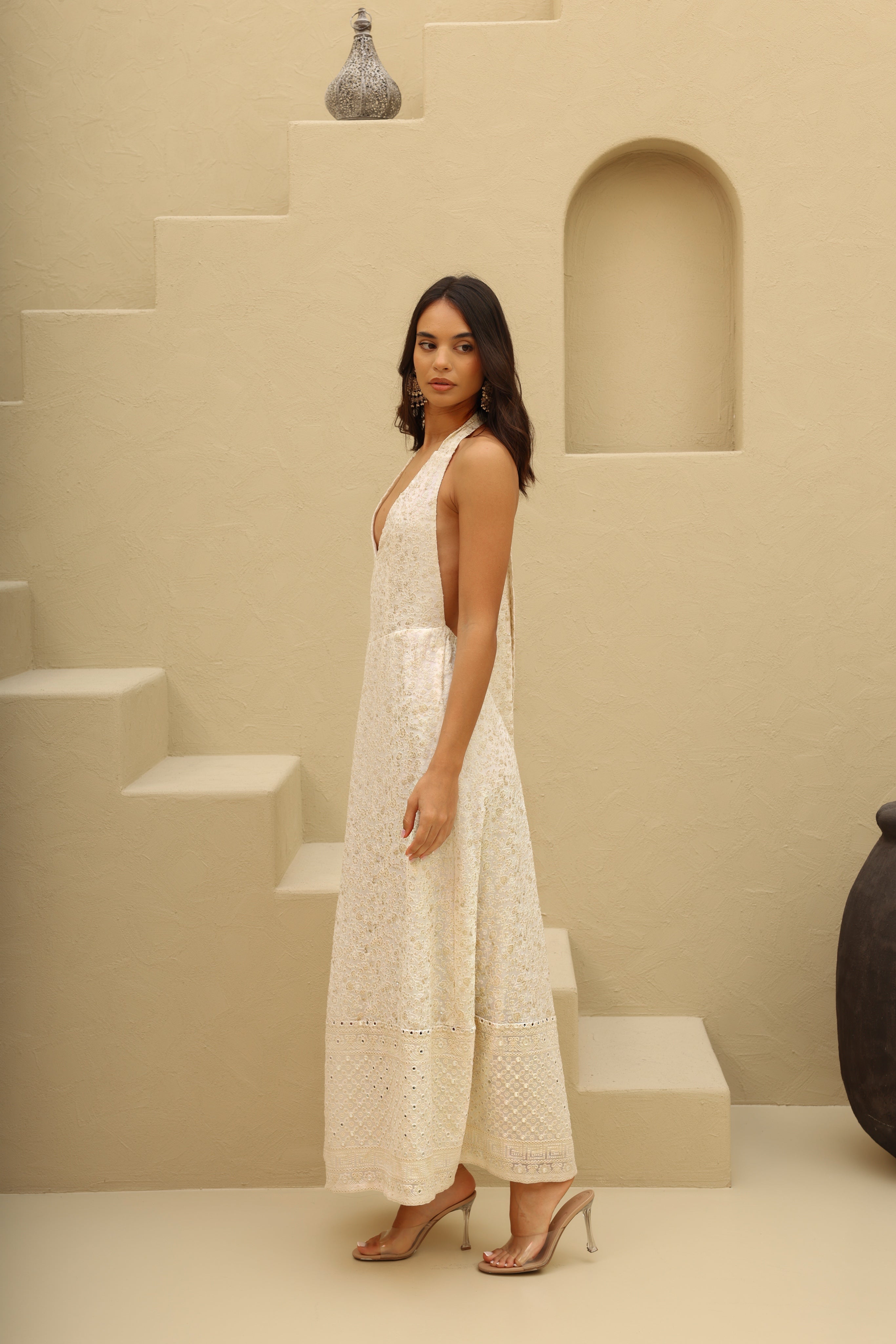 The Azra Dress is crafted from traditional Lucknowi (chikankari) fabric, featuring delicate gold threadwork and a mirror-work border at the hem. It has a halter neckline and an open back with an elastic band for a secure, comfortable fit. Designed in an A-line ankle length silhouette with a fitted bodice and soft flare through the skirt.