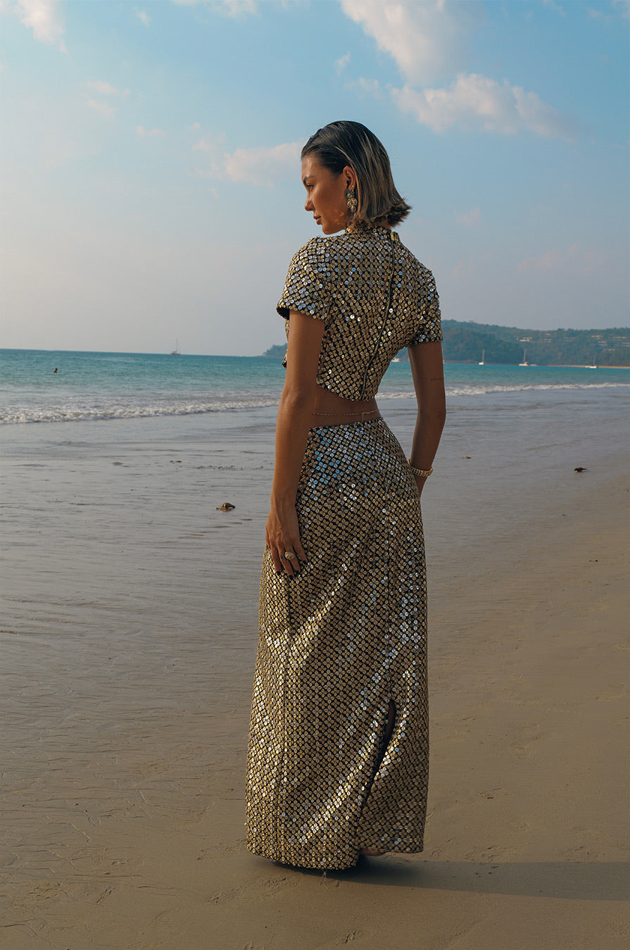 The Dhun Skirt features a sleek, full length silhouette in gold mirror work on a deep brown tone. Designed to create a flattering, elongated shape. Lightweight and fully lined.