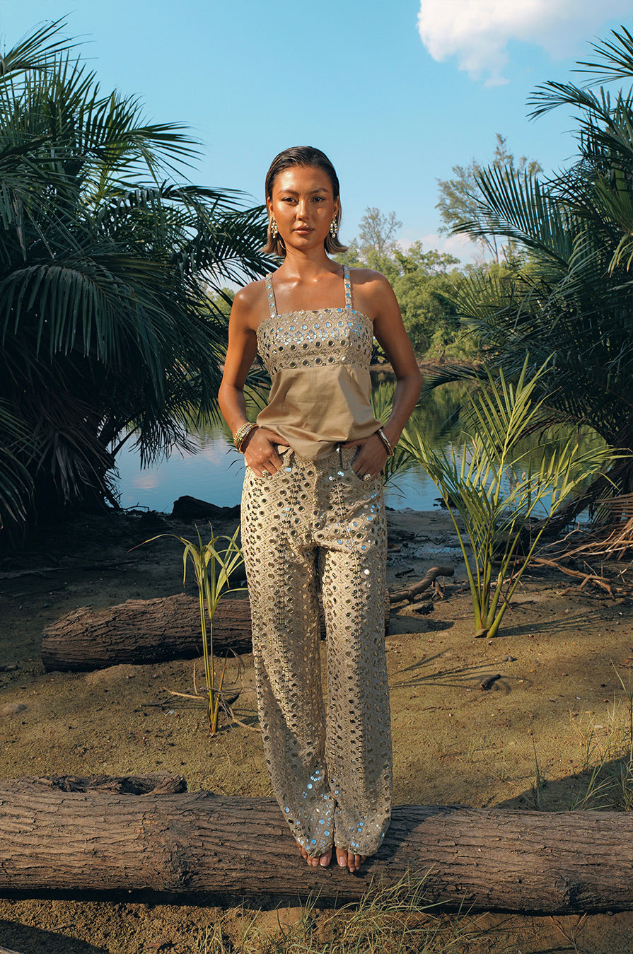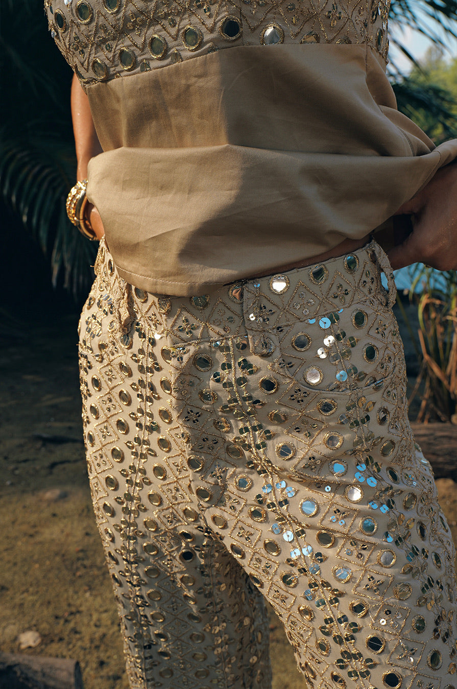 The Ehsa Pants are crafted from gold mirror work fabric in a sleek, elongated silhouette. Designed with a button and zip closure, they are finished with functional pockets. Lightweight and fully lined.