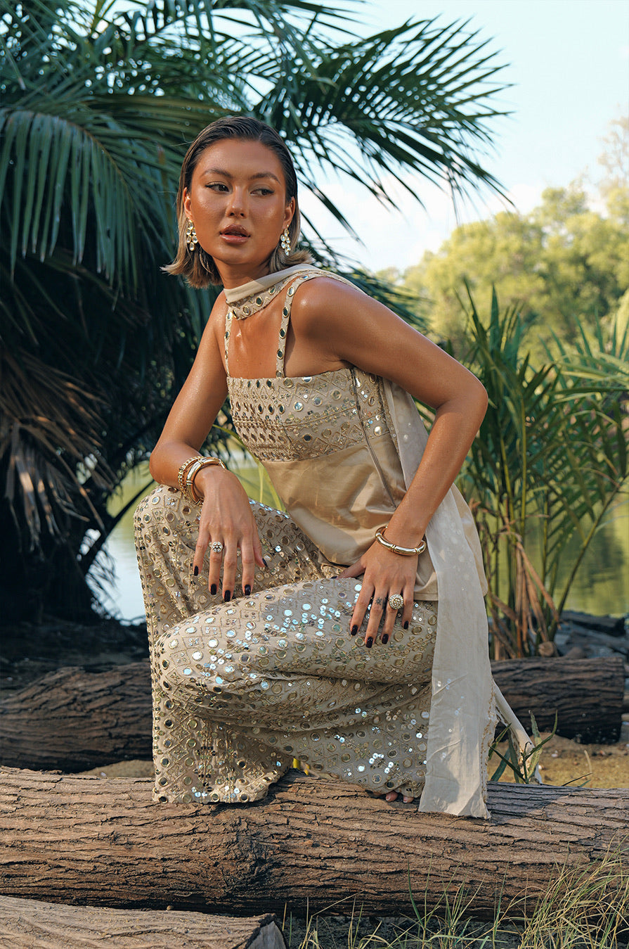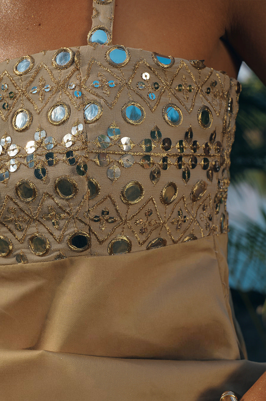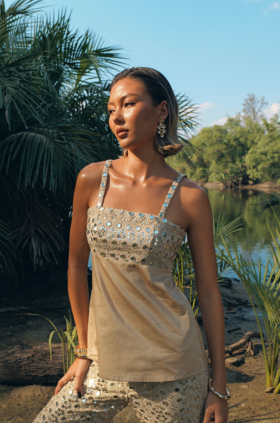 The Ehsa Top features gold mirrorwork detailing across the straps and chest, balanced with a soft cotton-blend body.