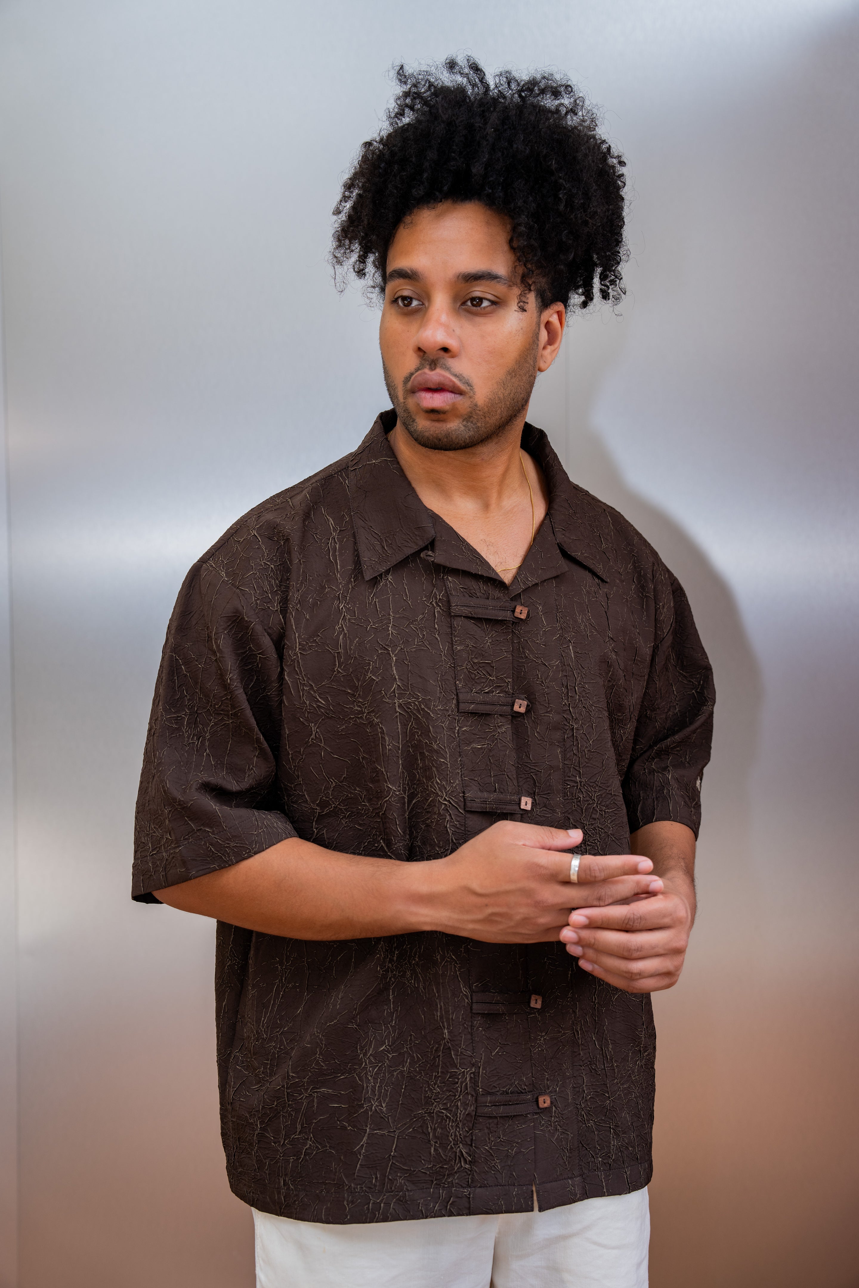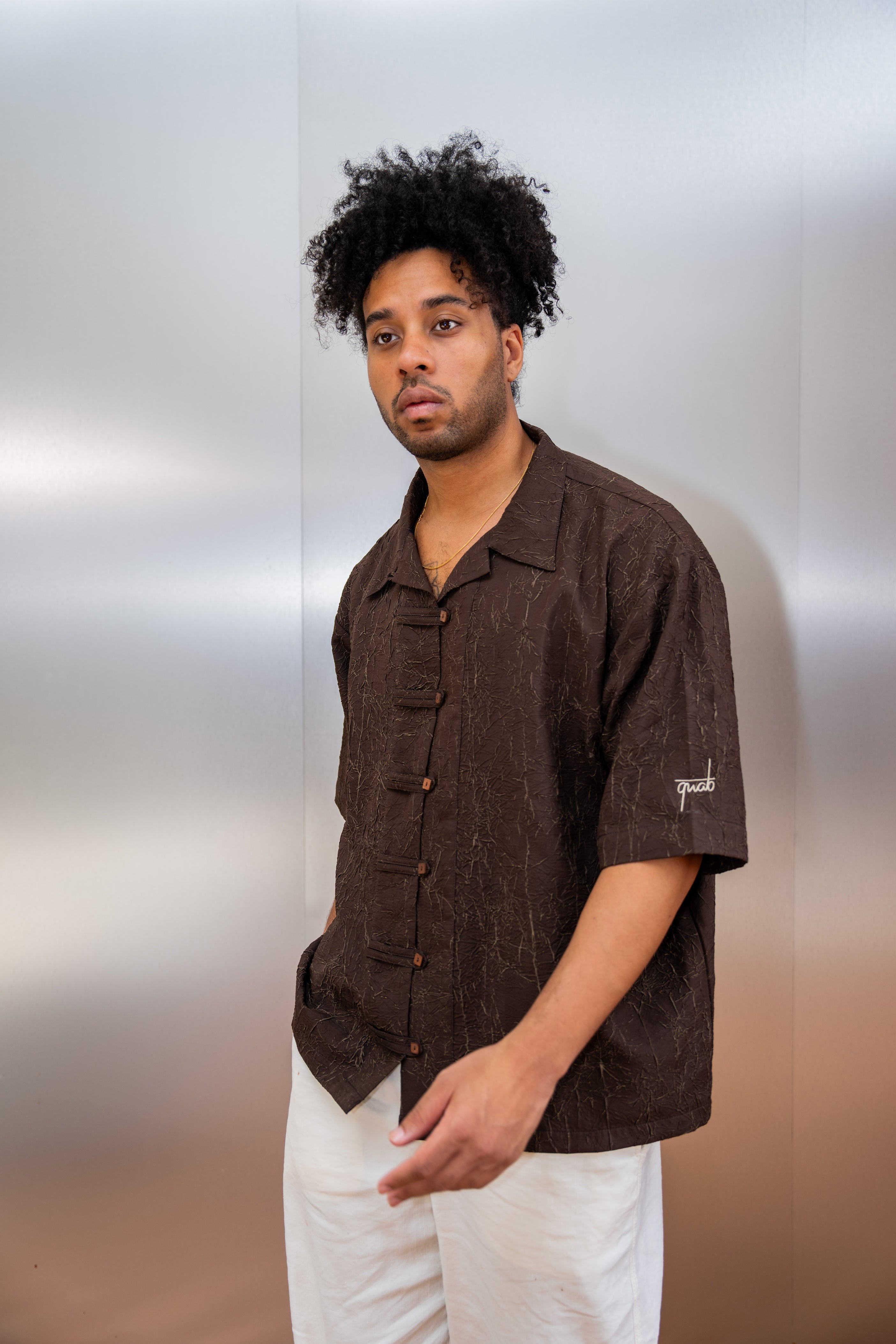 The Khus Shirt features a distinctive patterned fabric in earthy brown, finished with unique square button closures that set it apart. The boxy cut and short sleeves provide effortless wear, while the natural tonal variations in the fabric bring depth and dimension. A piece that feels both classic and modern, Khus is designed for those who value quiet detail.