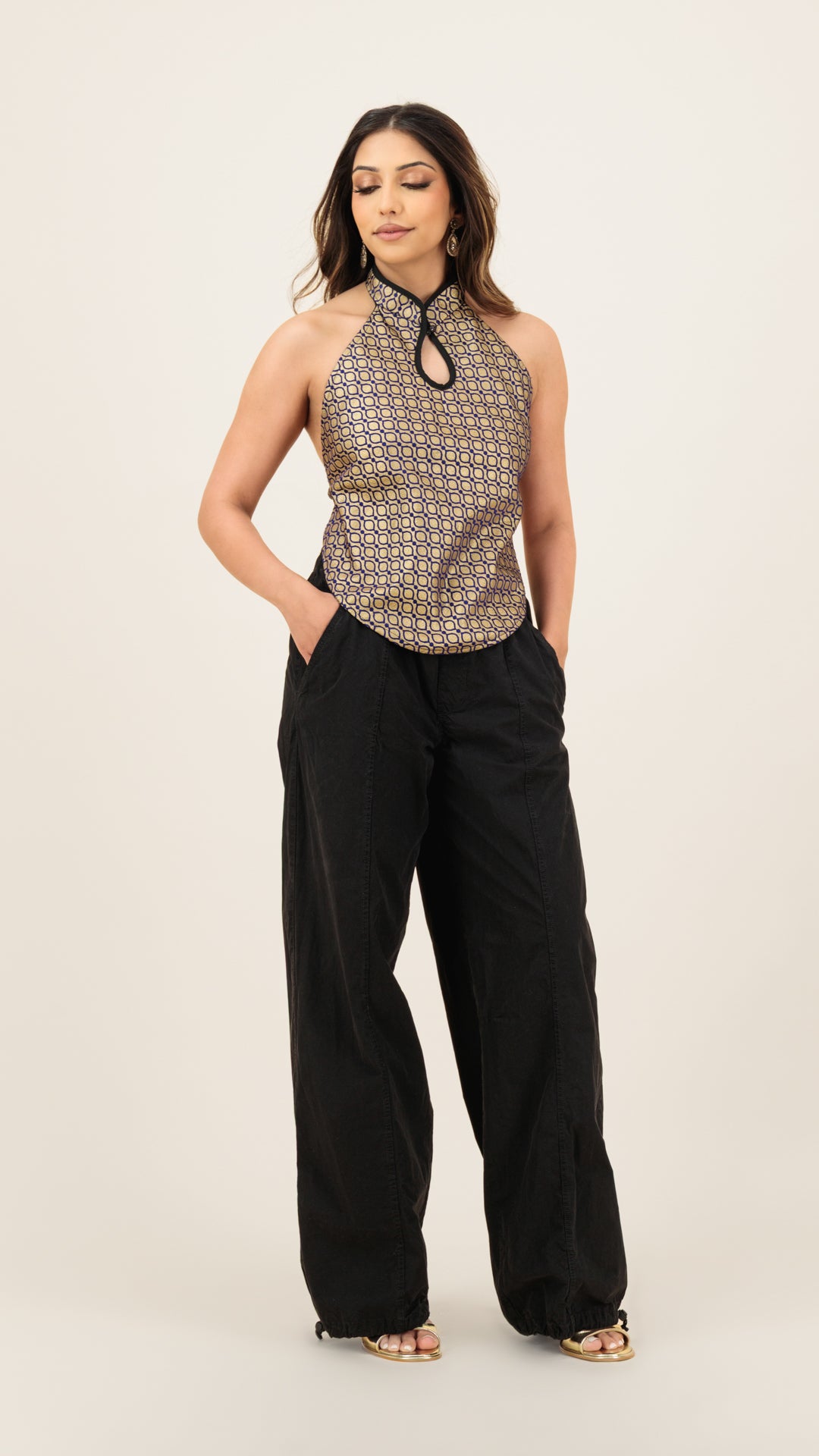 The Kiara Top is a gold brocade piece with a Chinese collar and backless design, exuding sophistication with a touch of vintage allure.