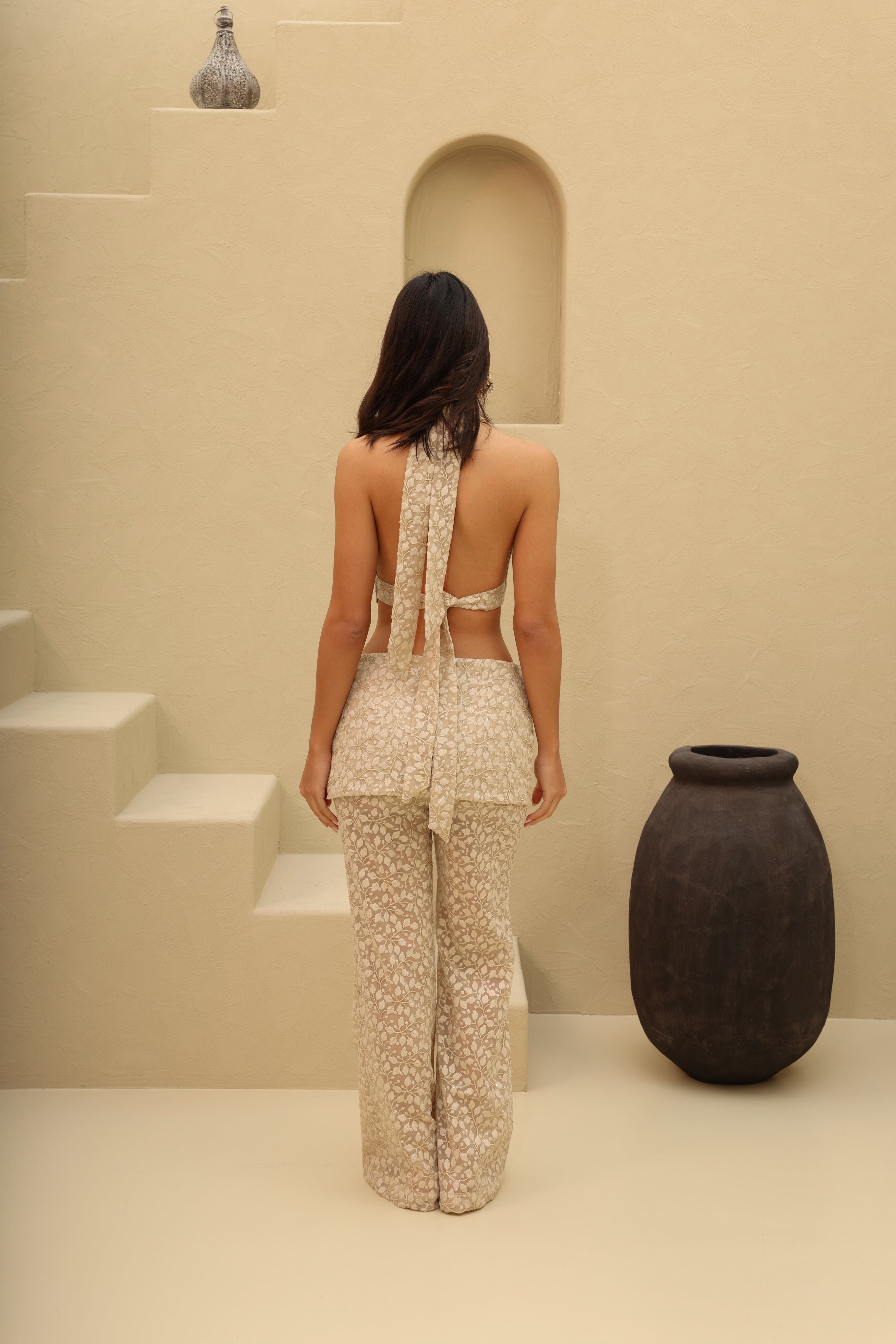 The Nas Pants are made from embroidered georgette with a subtle sheen. They feature a lined overlap panel at the waist for coverage, while the rest of the pants remain lightweight, sheer and easy to move in. Designed with a mini flair silhouette and finished with a side zipper for a clean fit.