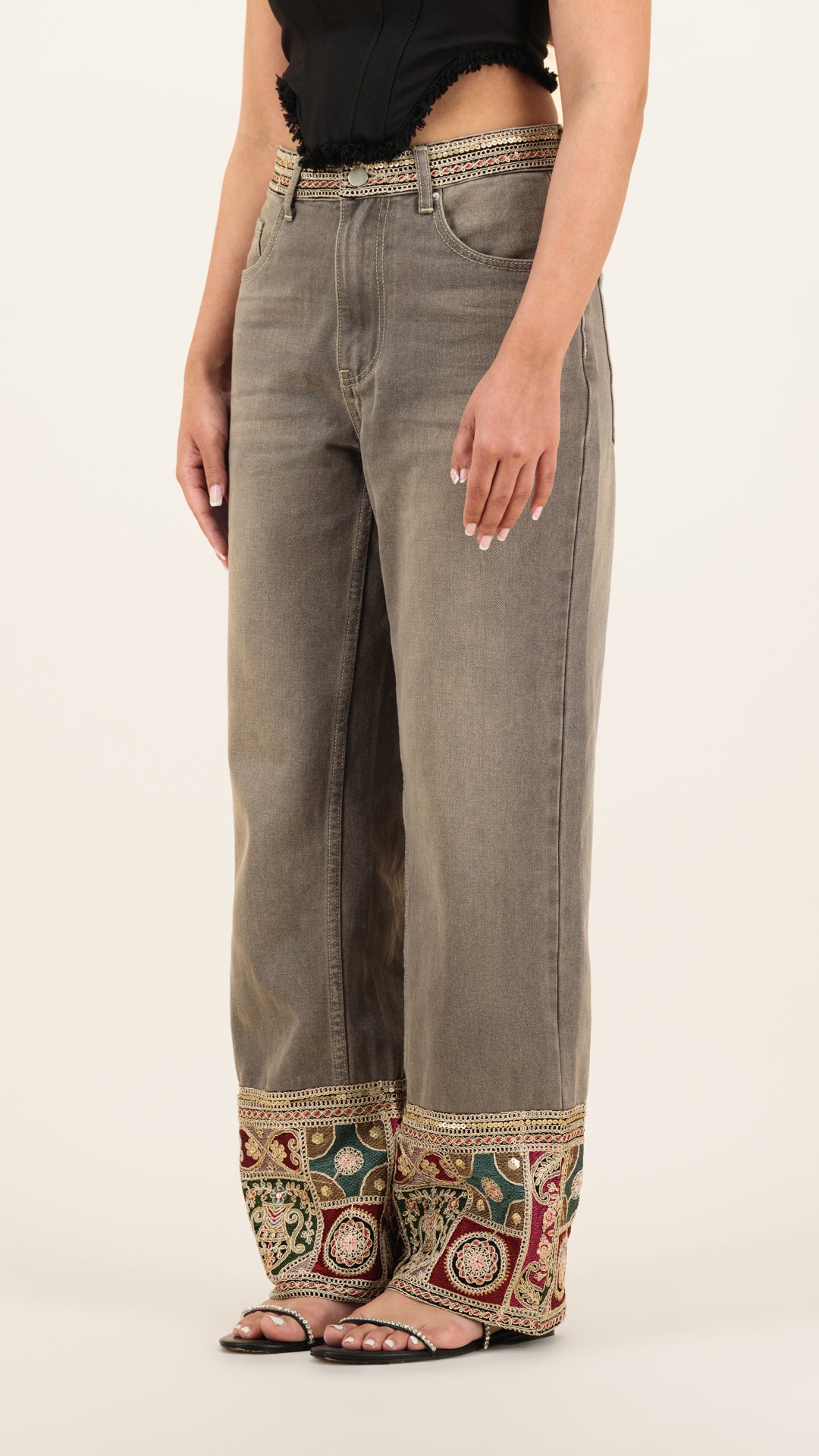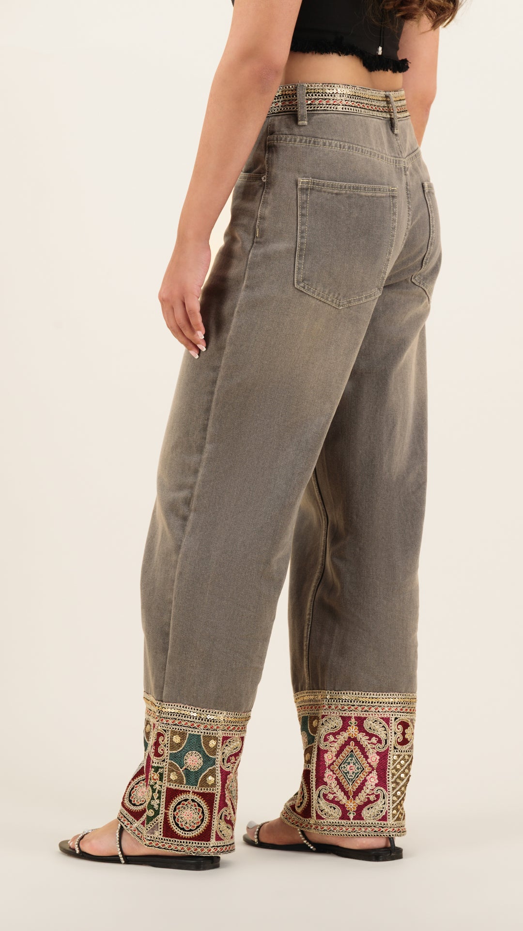 The Rene Jeans in grey offer a refined look with their brocade cuff, adding a subtle touch of traditional elegance for a luxe, understated feel.