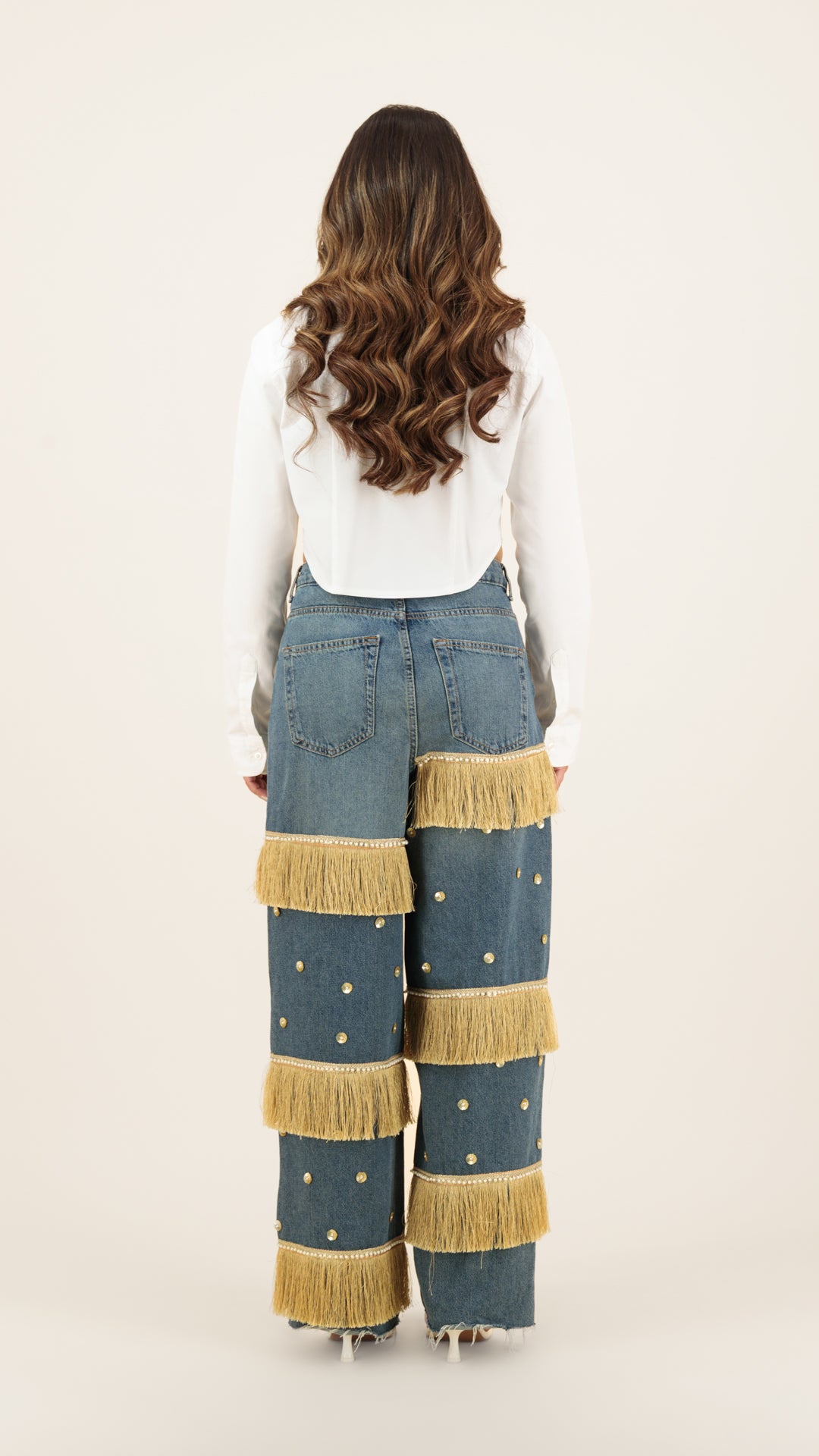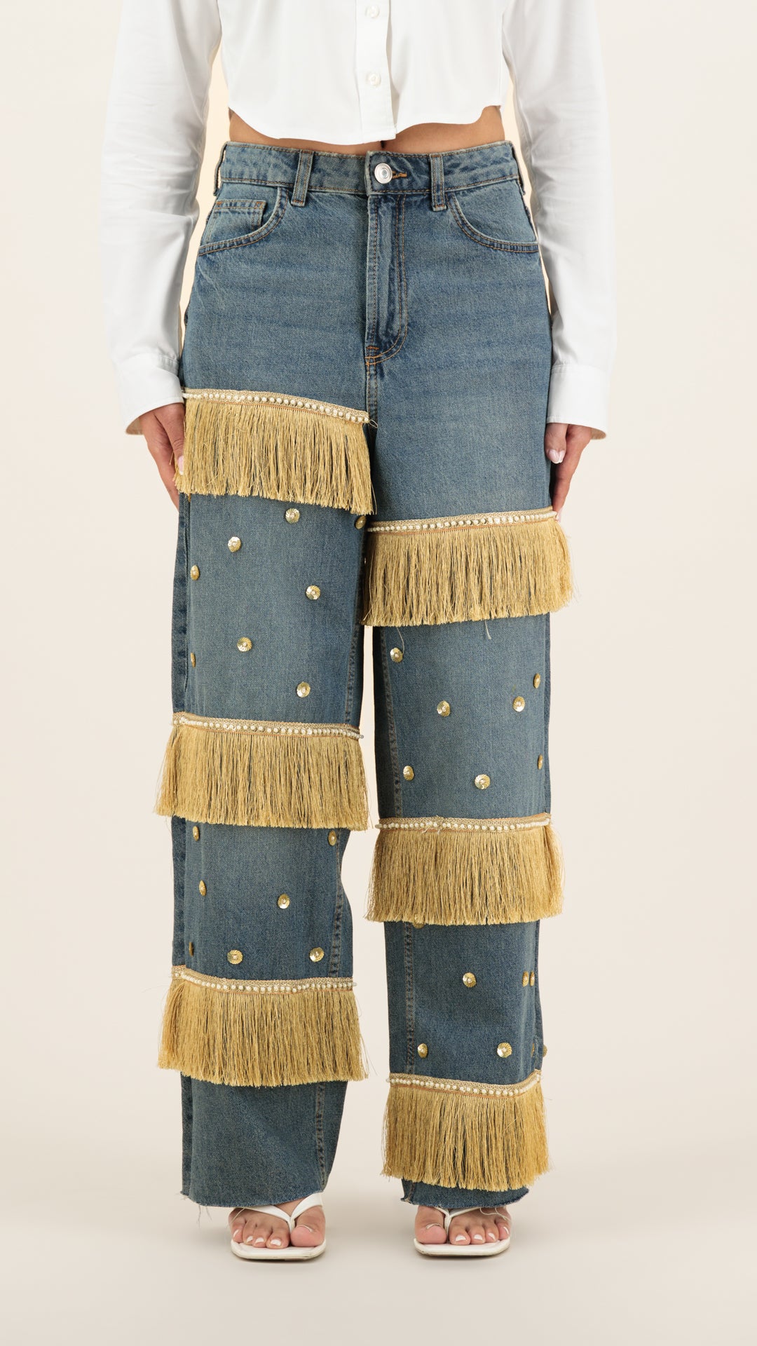 The Riva Jeans add a touch of glamour to your denim collection with gold tassels and embellishments, offering a modern fit with a nod to tradition.