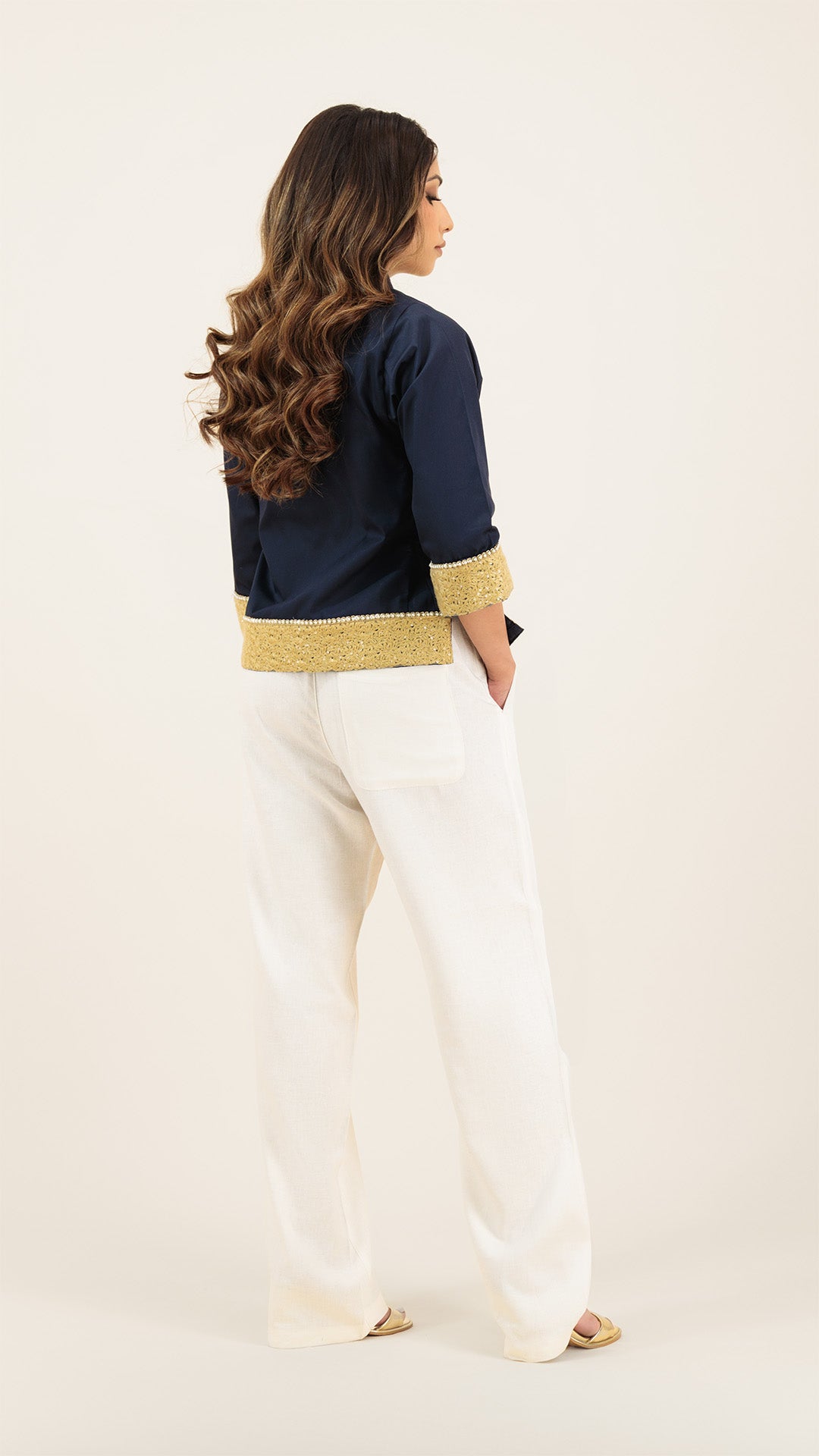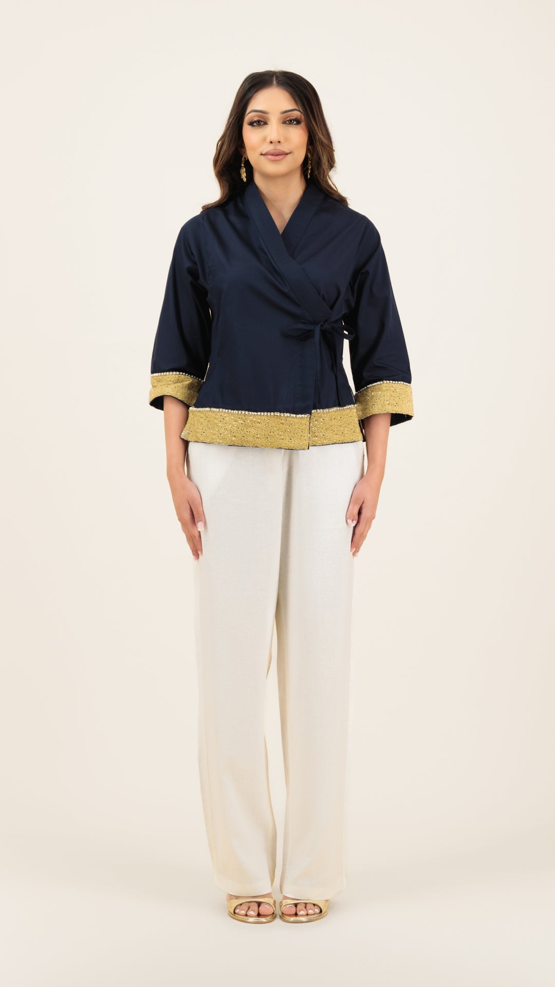 The Saira Tie Top in navy blends timeless elegance with modern style. Featuring delicate jute lace, this handmade piece showcases subtle variations in textile and detailing, reflecting its unique craftsmanship and sourcing.