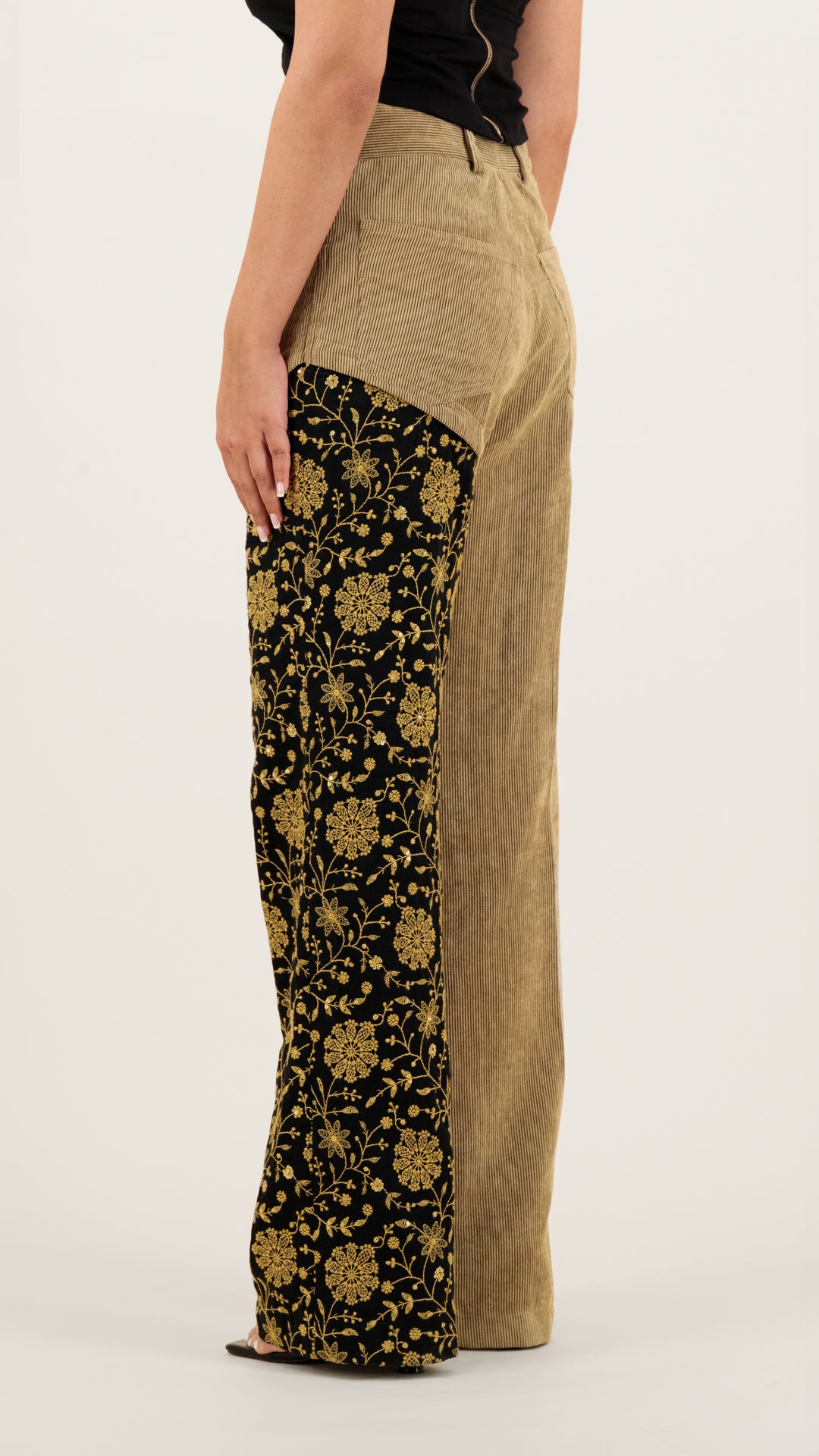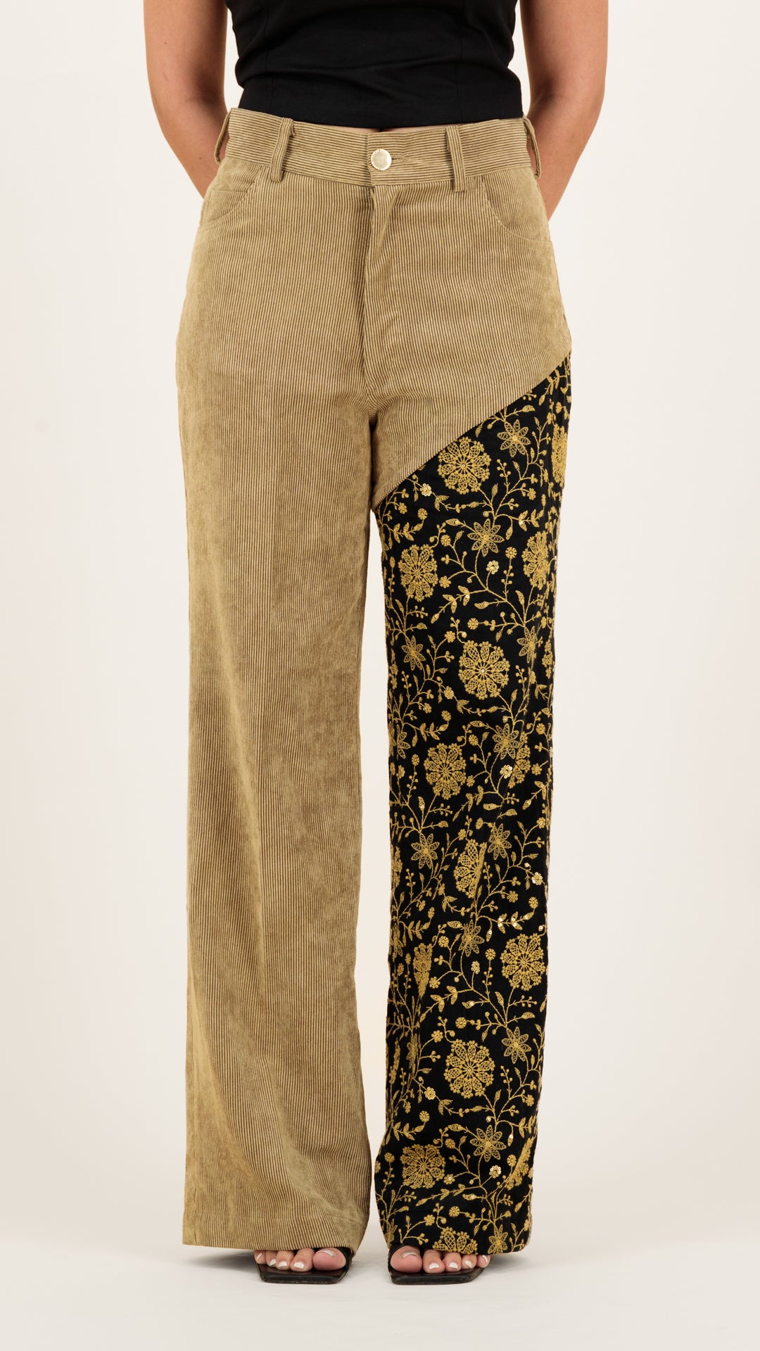 The Sasha Pants feature a unique fusion of Lucknowi and corduroy, offering a textured experience that pairs comfort with cultural artistry.